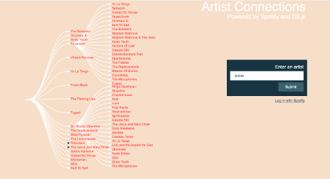 Initial exploration of the Spotify API. Using D3.js to display the artist connections.